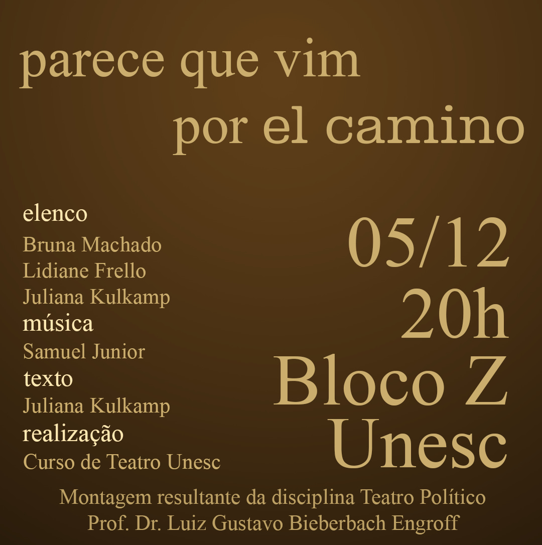 vocês me conhecem. eu amo eventos. e amanhã, dia 05/12, na belíssima cidade de Criciúma/SC, terá um evento! o curso de Teatro da Unesc apresentará a peça Parece que vim por el camino — e ela é ótima porque, spoilers, eu assisti os ensaios. eu estarei lá, o que significa que todas as pessoas legais de Criciúma também devem estar lá. ah droga. fiz um doxxing meu. tudo bem