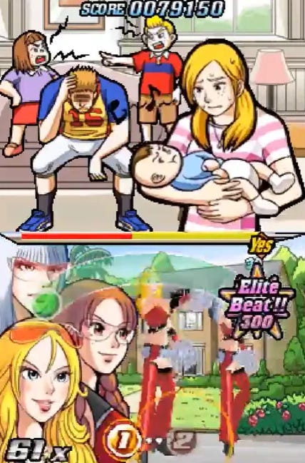 mas também todos os jogos de ritmo e tudo envolvendo o poder da música que o Nintendo DS nos trouxe. e não adianta admitir que não existe nada poderoso acontecendo na fase de Sk8er Boi em Elite Beat Agents. eu nunca havia ouvido falar de Sukima Switch antes daquela primeira fase de Moero! Nekketsu Rhythm Damashii Osu! Tatakae! Ouendan 2 e nunca ouvi falar depois. qual é mais icônica: a fase dos macaquinhos dançando j-pop ou a fase dos cientistas apaixonados em Rhythm Heaven? i suppose. Maestro! Jump in Music é sobre música e pulos. Feel the Magic: XY/XX nem é sobre música, mas é sobre respiração. eu vejo ambos conceitos como a mesma coisa